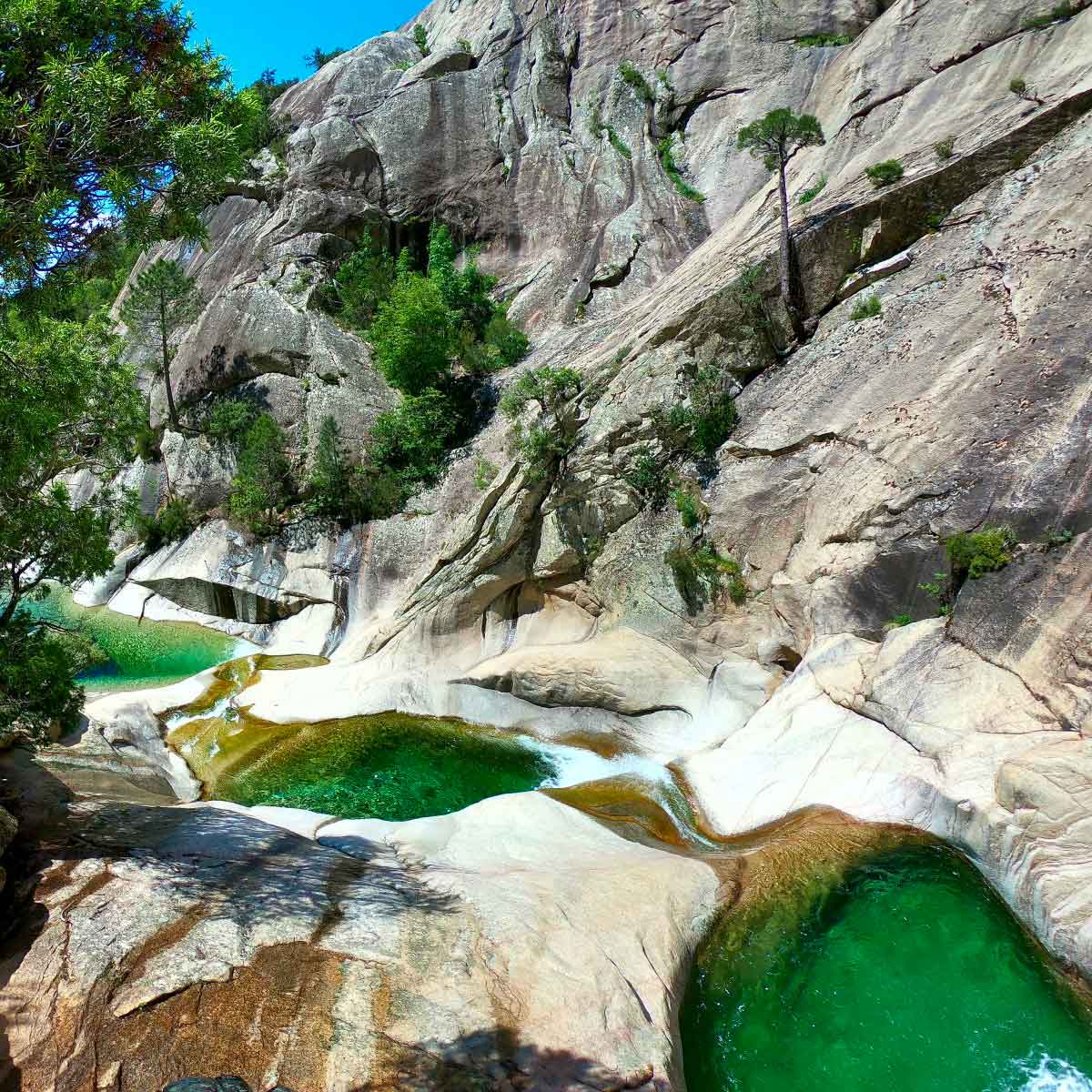 Accès: A partir du col de Bavella, emprunter la D 268 qui redescend vers Solenza. Au troisième pont (environ 7 km), vous apercevrez le Pulischeddu poursuivant sa course. Un sentier remonte le cours d’eau et mène, en quelques minutes de marche, aux premières vasques.